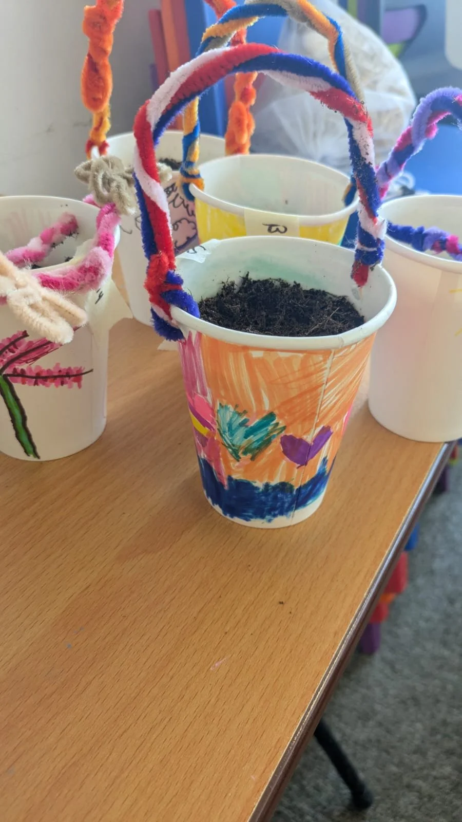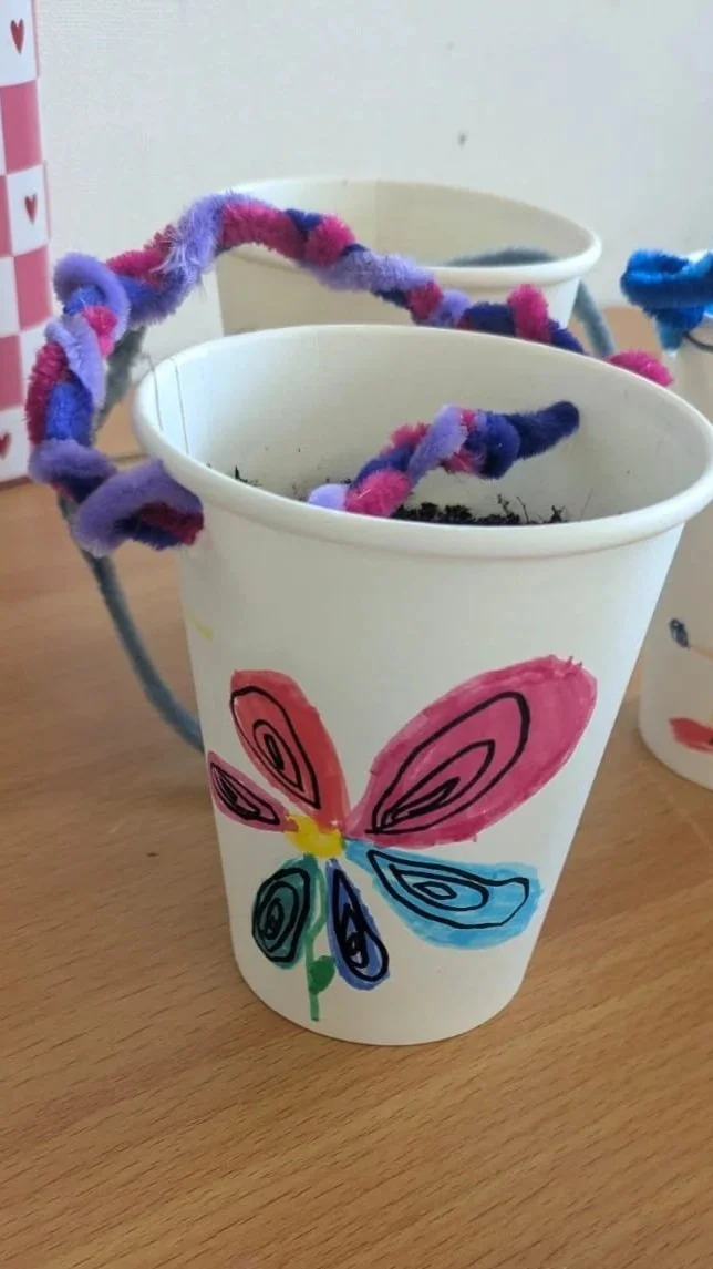 You will create a lovely hanging planter from a cup with a plant to grow.