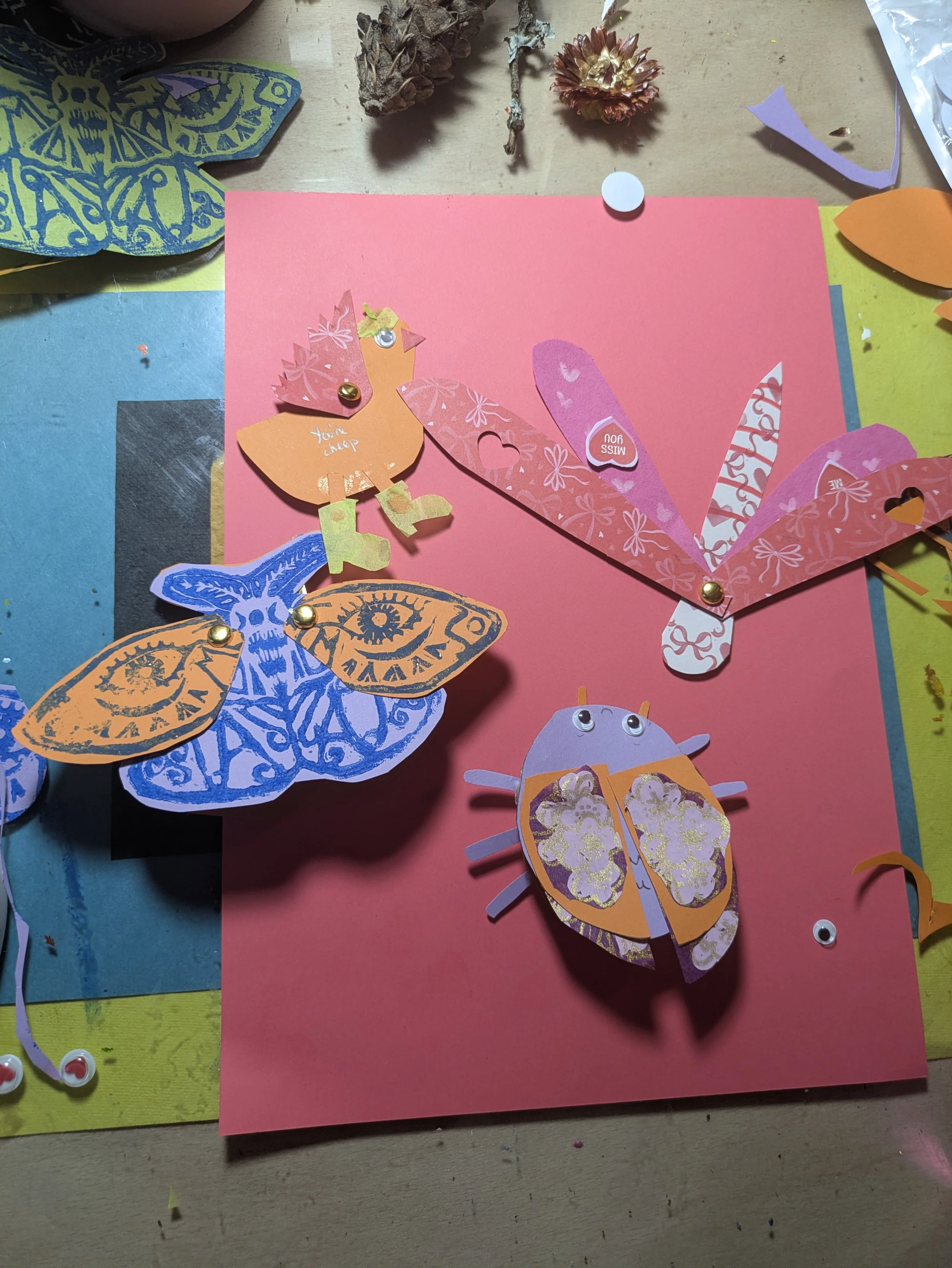Using Collage materials stamps and more you will create a paper bug or bird with movable wings, legs or antennae